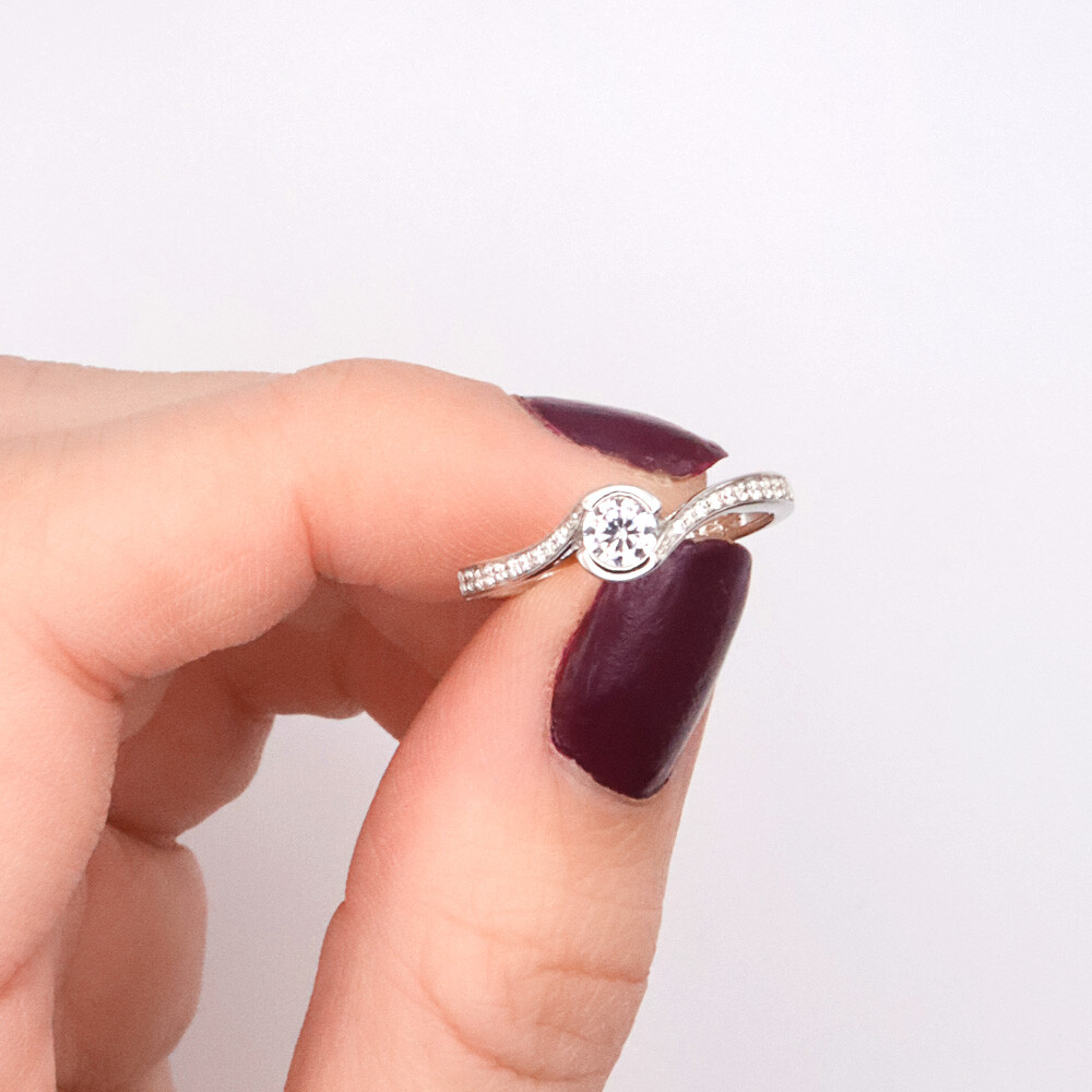 Wunderschöner geschwungener Antragsring aus rhodinierten 925er Silber mit glänzend polierter Oberfläche. Die Rhodium-Schicht sorgt für schönen glänzenden Look und schützt vor Verfärbungen. Der Ring ist hochwertig verarbeitet, mit einem großen mittig platzierten Zirkonia und weiterem strahlenden Zirkonia-Besatz entlang der Ringschiene - modisch und elegant zugleich. Ein süßer Schmuckring für den Alltag welcher als Geschenk oder einfach für sich selbst viel Freude bereitet.