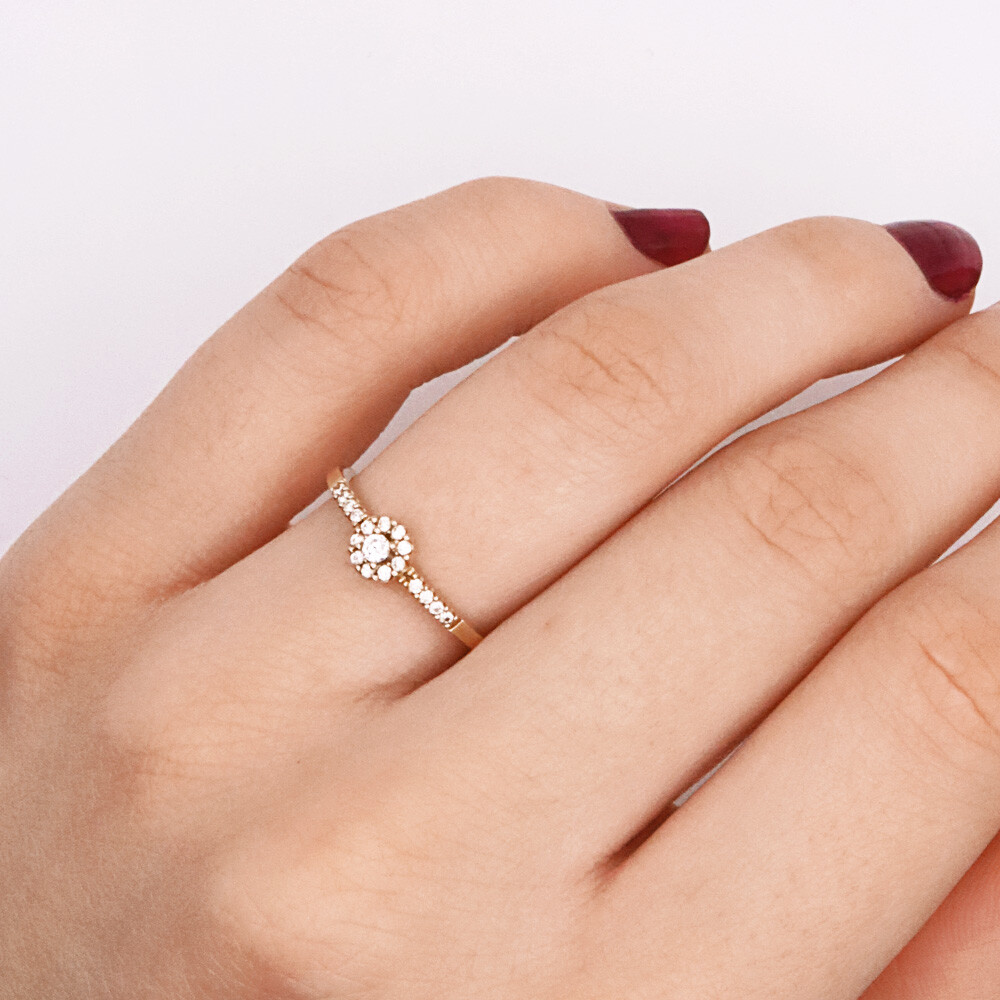 Der Diamantring Piccolina aus zartem Roségold ist ein handwerklich perfekt verarbeitetes Schmuckstück – mit viel Liebe zum Detail. Mit seinem funkelnden Brillanten zieht dieser Ring jeden Blick auf sich. Als Highlight thront zentral ein großer Brillant welcher von mehreren Brillanten zu einem Kranz umgeben ist.
