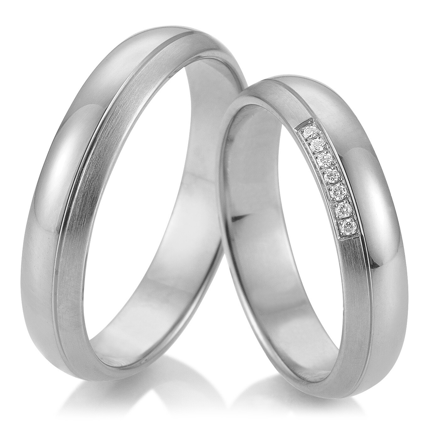 Wunderschöne Trauringe aus Weißgold mit teils mattierter und teils polierter Oberfläche. Der Damenring ist mit mehreren strahlenden Brillanten veredelt. Die Ringe aus der Basic Light Kollektion von Breuning sind bombiert, für optimalen Tragekomfort.