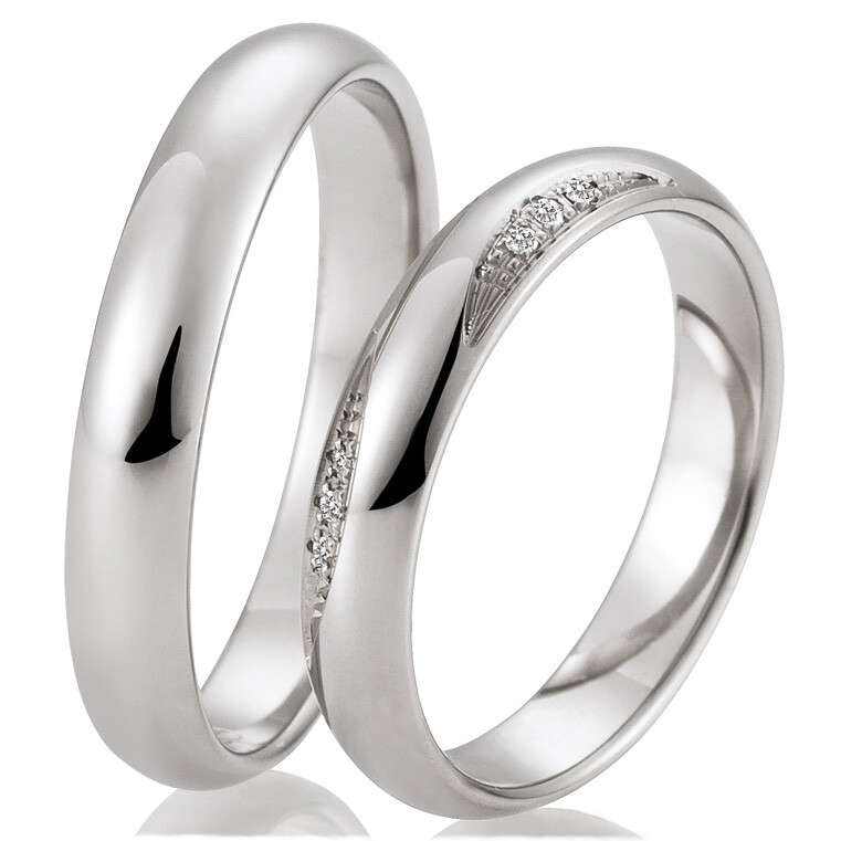 Moderne Trauringe der Firma Breuning aus Weißgold. Diese edlen Trauringe sind elegant und wunderschön. Für einen optimalen Tragekomfort sind die Ringe innen bombiert (abgerundet).
