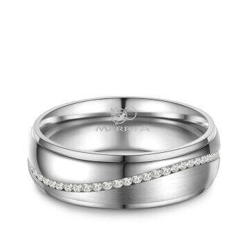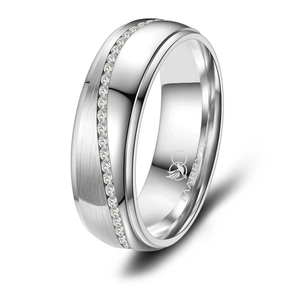 Diese Edelstahl Damenring ist einfach zauberhaft. Die Oberfläche ist zur Hälfte poliert oder längsmatt gehalten, durchzogen von einer wunderschönen mattierten Wellenfuge. Diese Welle ist umlaufend mit mehreren Zirkonia voll ausgefasst. Die Innenseiten sowie die äußeren Ränder sind auf Hochglanz poliert. Die Steine werden sicher in einer Kanalfassung gehalten. Für optimalen Tragekomfort sorgt die leichte Bombierung an den Innen- und Außenseiten.