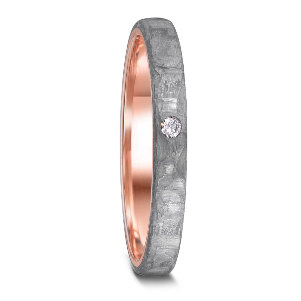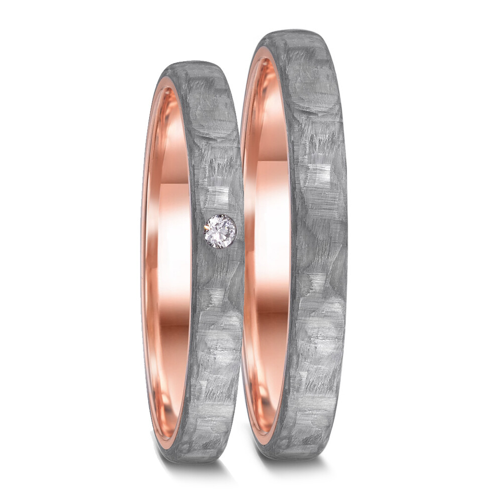 Sehr ausgefallene, schmale Eheringe oder Partnerringe aus 585er Rotgold fest ummantelt mit grauem Carbon im schlichten und zeitlosen Design. Der Damenring ist mit einem funkelnden Brillanten veredelt welcher in Kombination mit dem hellem Carbon besonders strahlt. Das Ringprofil ist innen und außen leicht bombiert, das sorgt für angenehmen Tragekomfort. Wunderschöne Ringe Made in Germany!