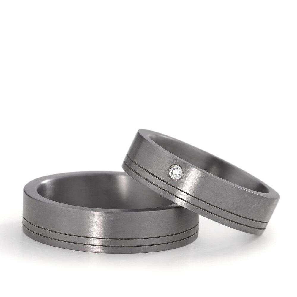 Moderne Partnerringe aus Tantal mit mattierter Oberfläche. Der Damenring ist dabei mit einem funkelnden Diamanten (0,030 ct. w/si) besetzt. Beide Ringe, welche auch als Freundschaftsringe getragen werden, sind innen und außen gerade. Das sorgt für ein hervorragendes Tragegefühl. Tantal ist ein sehr kratzfestes Material welches zudem äußerst unempfindlich gegenüber Tragespuren ist. Gern gravieren wir diese Ringe mit Ihrem Wunschtext.