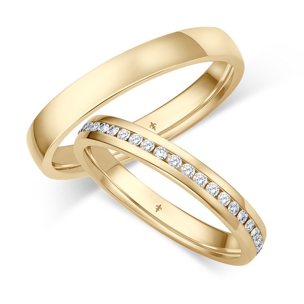 Faszinierende Trauringe und Eheringe Janine aus Gelbgold mit glänzend polierter Oberfläche. Der Damenring ist mit mehreren lupenreinen Diamanten im Brillantschliff veredelt. Beide Ringe sind bombiert, für angenehmen Tragekomfort.