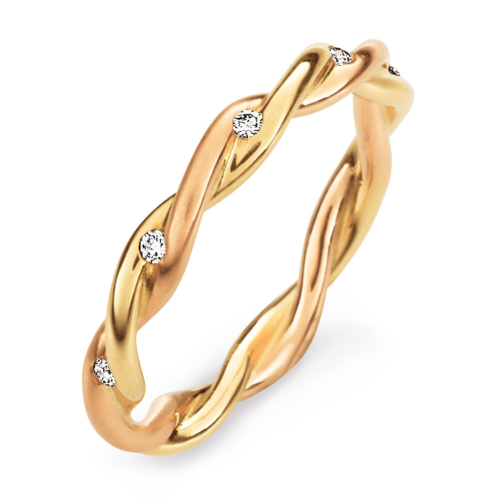 Ein wunderschöner gedrehter Memoire-Ring aus der Max Kemper Ringfabrik. Der Ring, mit mehreren Brillanten veredelt, ist aus Rot- und Gelbgold gefertigt.