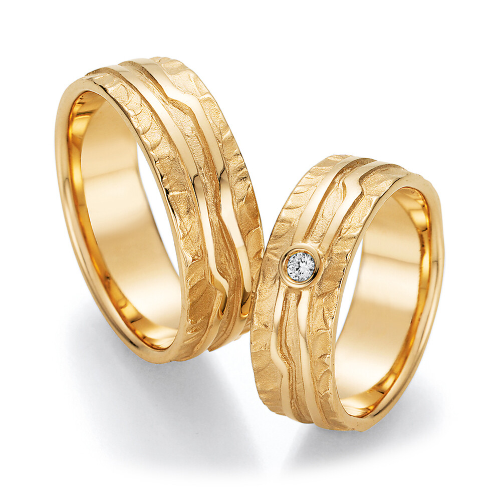Ein sehr schöner Ring aus Gelbgold mit tollen ziselierten Fugen und einem strahlenden Brillianten am Damenring. Für ein besseres Tragegefühl sind die Ringe innen leicht bombiert.