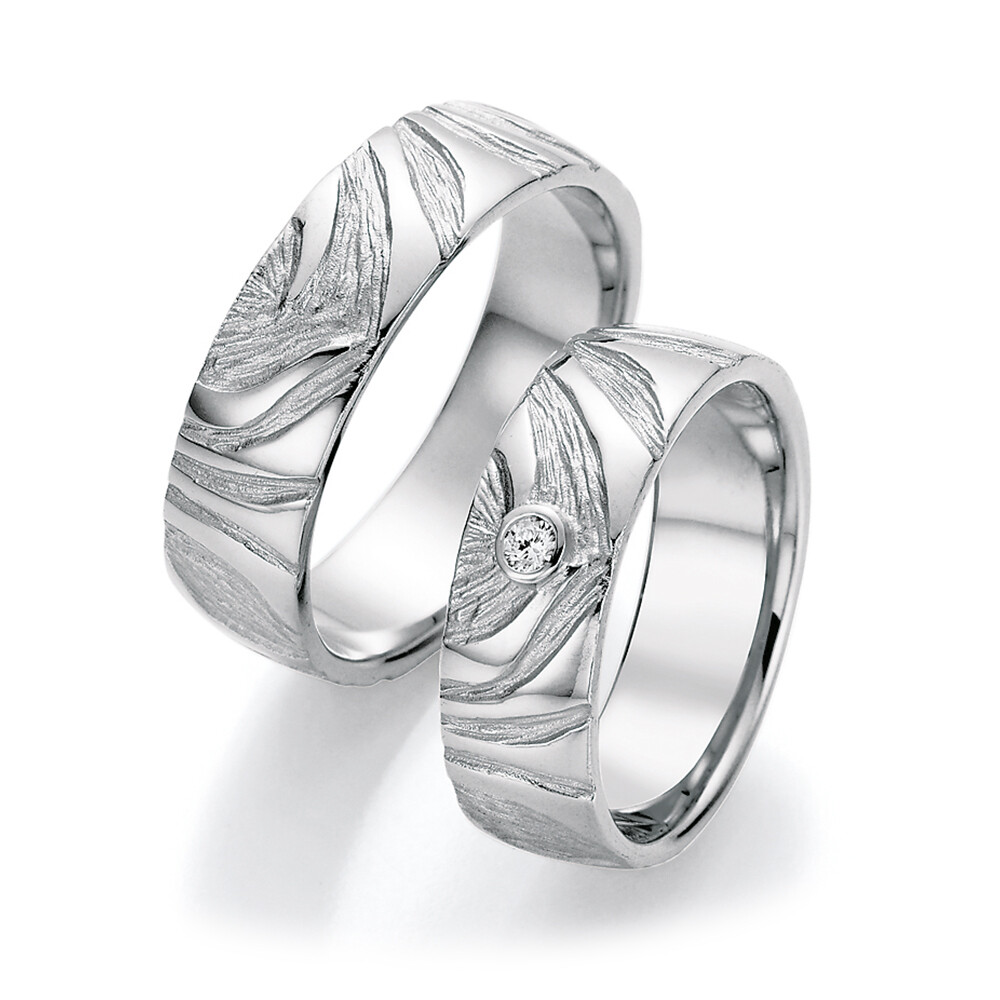 Anmutige Trauringe aus 925er Silber. Der Damenring besitzt einen faszinierenden eingeriebenen Brillanten mit 0,04 ct. w/si und bezaubert wirklich jedes Herz. Das Besondere an diesen großartigen Ringen ist die phantastische Oberfläche mit Muster. Der Brillant kommt auf dieser Oberfläche eindrucksvoll zum Strahlen. Was für eine schöne Symbiose! Ringe so individuell wie eure Liebe.