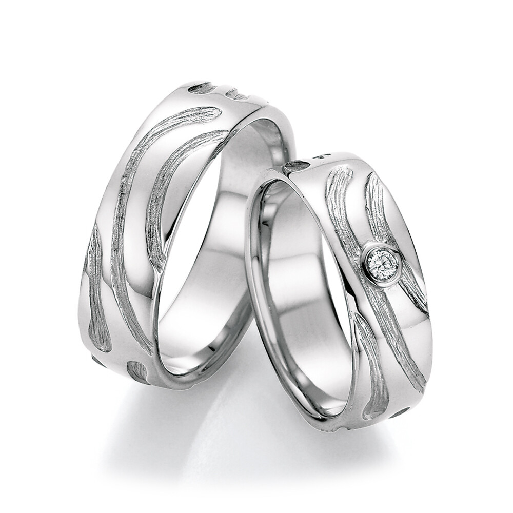Anmutige Trauringe aus modernem Weißgold. Der Damenring besitzt einen faszinierenden eingeriebenen Brillanten mit 0,045 Karat w/si bezaubert er doch wirklich jedes Herz. Das Besondere an diesen großartigen Ringen ist die phantastische Oberfläche mit Muster. Der Brillant kommt auf dieser Oberfläche eindrucksvoll zum Strahlen. Was für eine schöne Symbiose! Ringe so individuell wie eure Liebe.