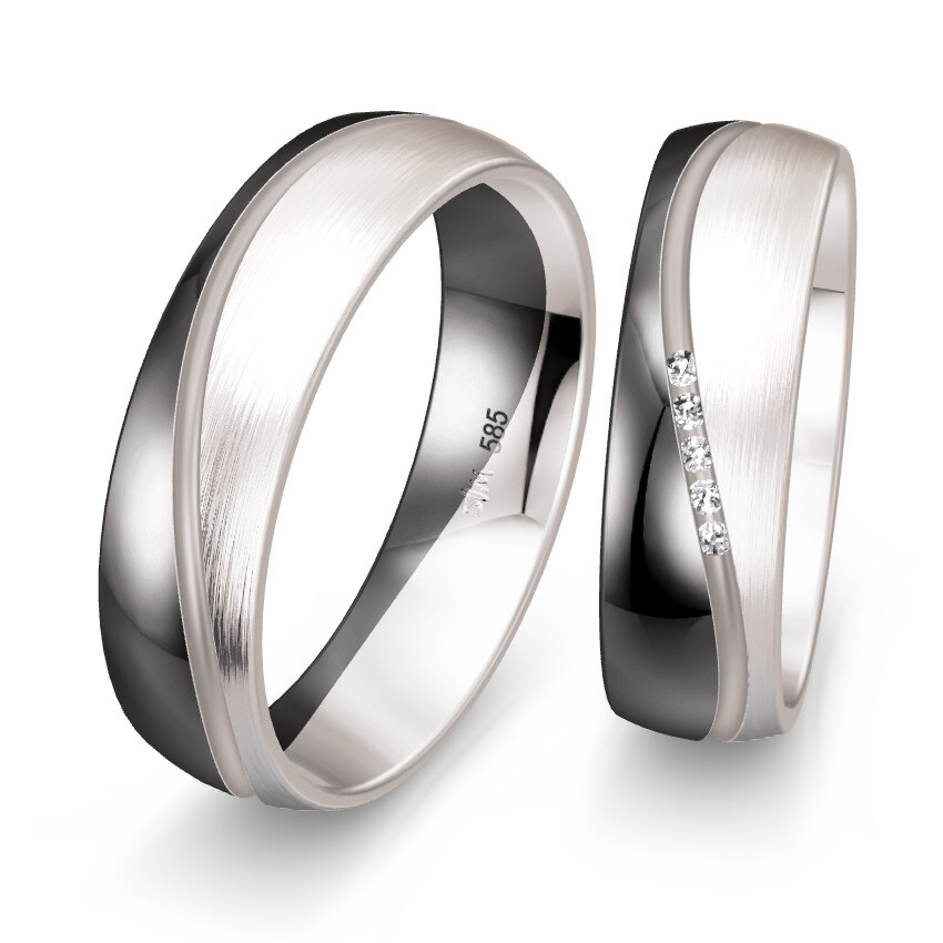 Wunderschöne Trauringe in 6 mm Breite von Saint Maurice aus Graugold & Weißgold aus der Kollektion Nightline. Der Damenring ist mit mehreren strahlenden Brillanten veredelt. Beide Ringe sind bombiert, für angenehmen Tragekomfort.