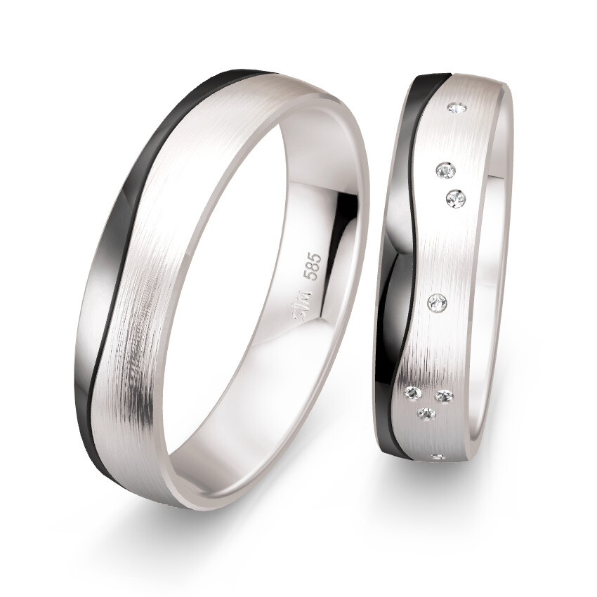 Wunderschöne Trauringe in 5 mm Breite von Saint Maurice aus Graugold & Weißgold aus der Kollektion Nightline. Der Damenring ist mit mehreren Brillanten veredelt. Beide Ringe sind bombiert, für angenehmen Tragekomfort.