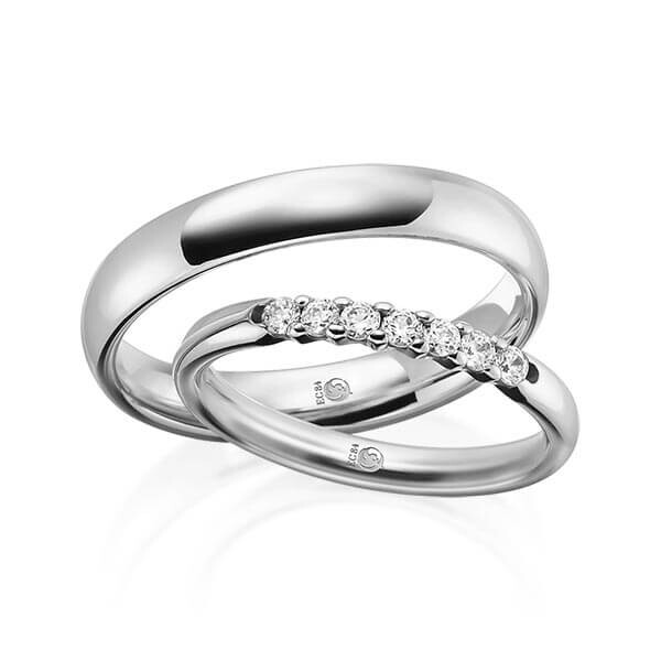 Paar Trauringe / Eheringe von Rubin Außen und innen gerundet in Palladium 585/-. Steinbesatz mit zus. 0,21 ct. tw, si - feines weiß mit kleinen Einschlüssen.