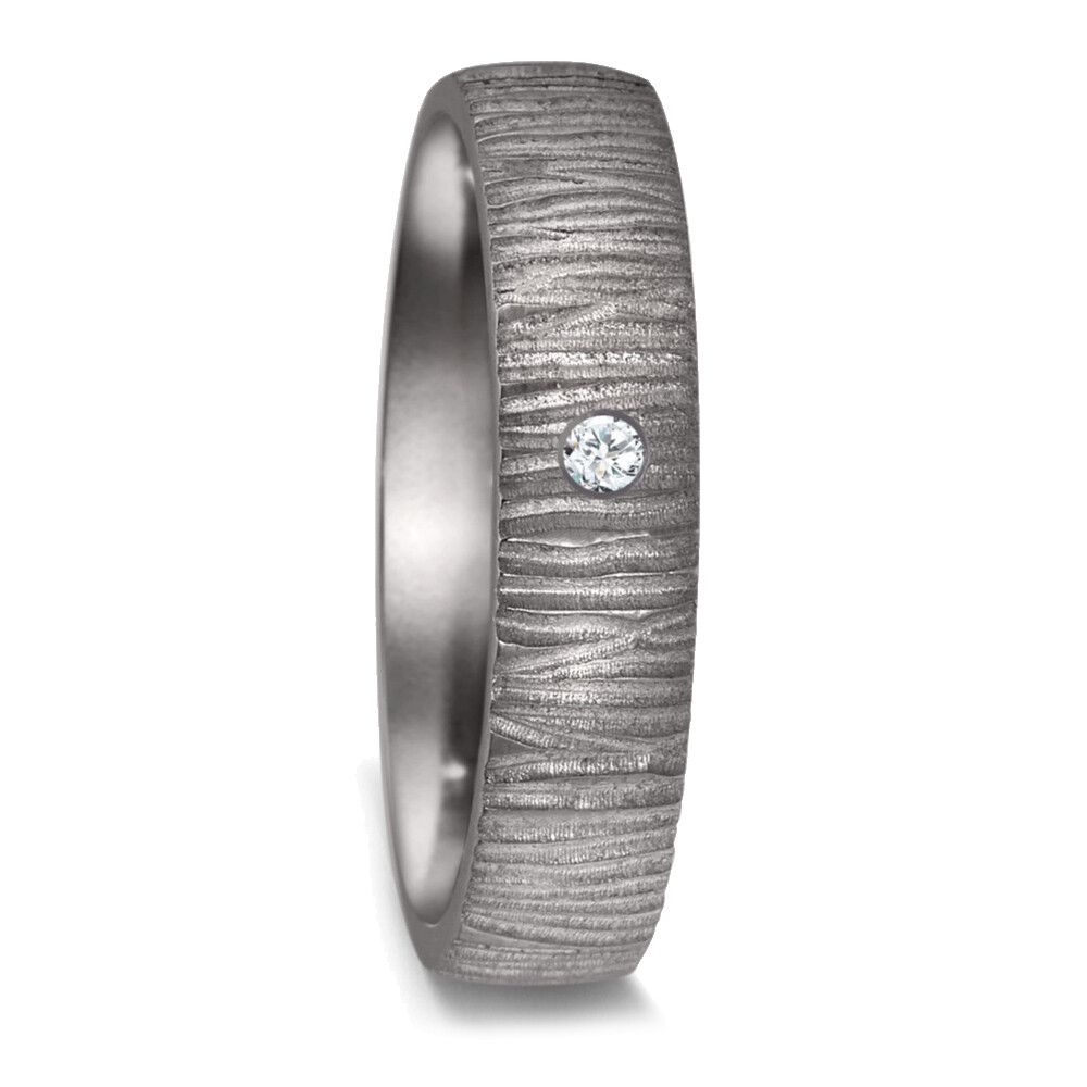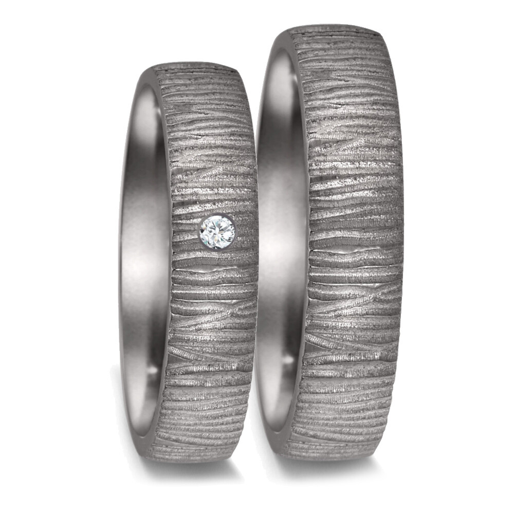 Atemberaubende Eheringe / Partnerringe aus Tantal mit strukturierter Oberfläche. Der Damenring ist dabei mit einem strahlenden Diamanten (0,030 ct. w/si) besetzt. Beide Ringe, welche auch als Freundschaftsringe getragen werden können, sind innen und außen bombiert. Das sorgt für ein hervorragendes Tragegefühl. Tantal ist ein sehr kratzfestes Material welches zudem äußerst unempfindlich gegenüber Tragespuren ist. Gern gravieren wir diese Ringe mit Ihrem Wunschtext.
