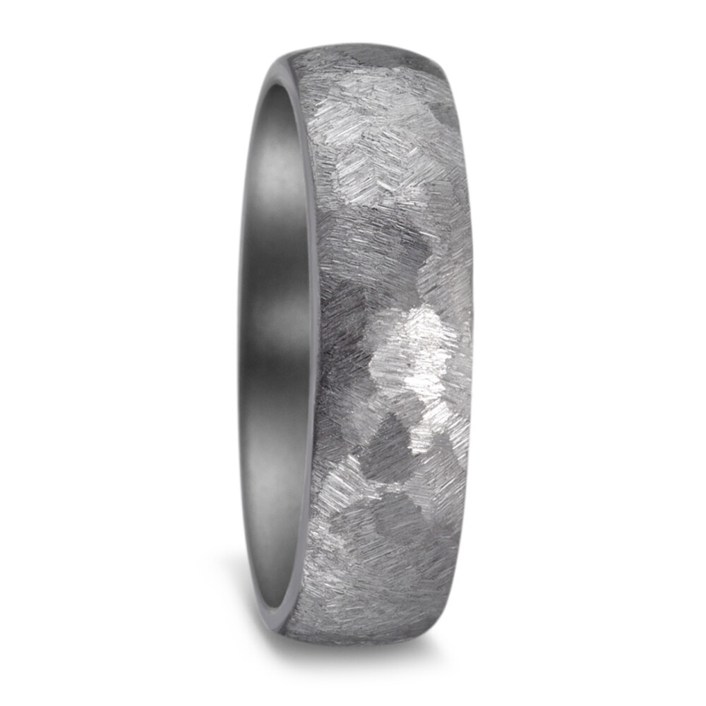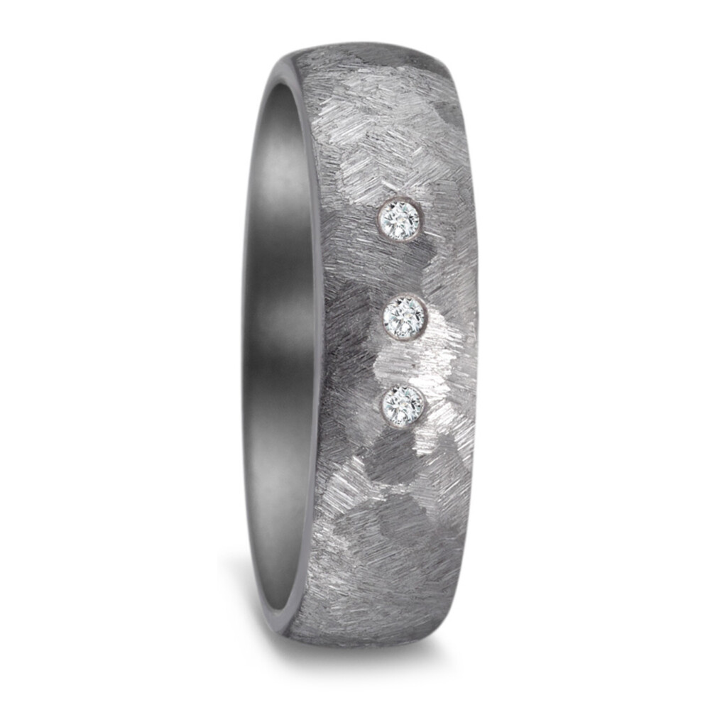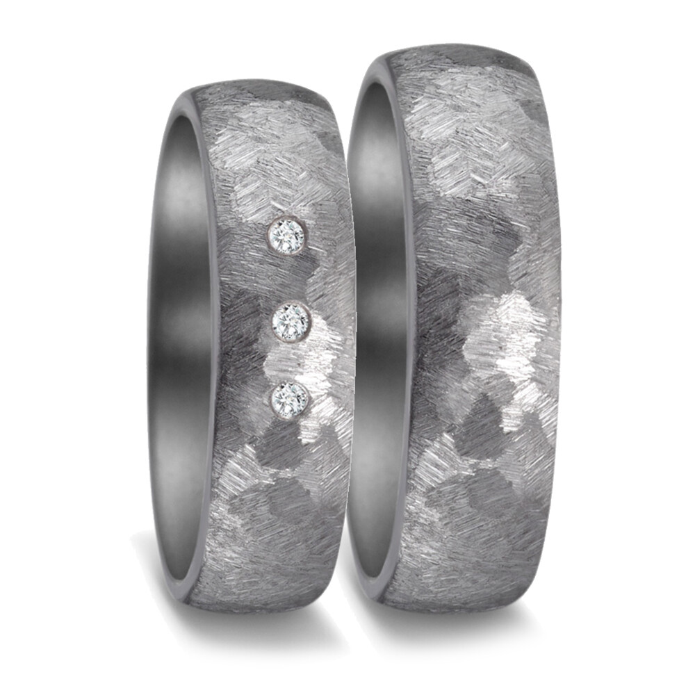 Herrliche Eheringe aus Tantal mit strukturierter Oberfläche in Hammerschlag-Optik. Der Damenring ist dabei mit mehreren funkelnden Diamanten (ges. 0,030 ct. w/si) besetzt. Beide Ringe, welche auch als Partnerringe getragen werden, sind innen und außen bombiert. Das sorgt für ein hervorragendes Tragegefühl. Tantal ist ein sehr kratzfestes Material welches zudem äußerst unempfindlich gegenüber Tragespuren ist. Gern gravieren wir diese Ringe mit Ihrem Wunschtext.