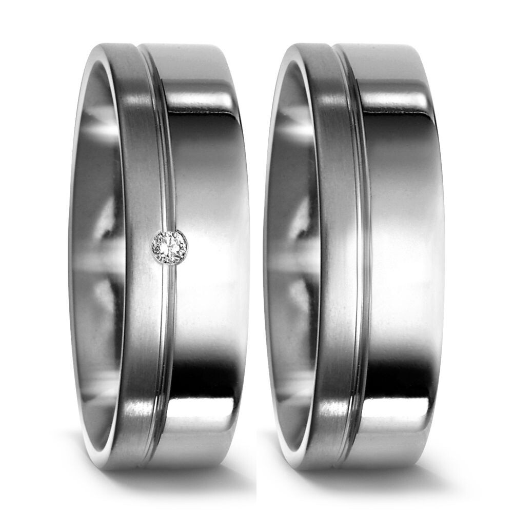 Fantastisch leichte Trauringe aus Titan. Beide Ringe haben eine interessante asymmetrisch versetzte Fuge auf dem Ring. Der Damenring hat einen 0,02 Carat Diamant in w/si Schmuckqualität.