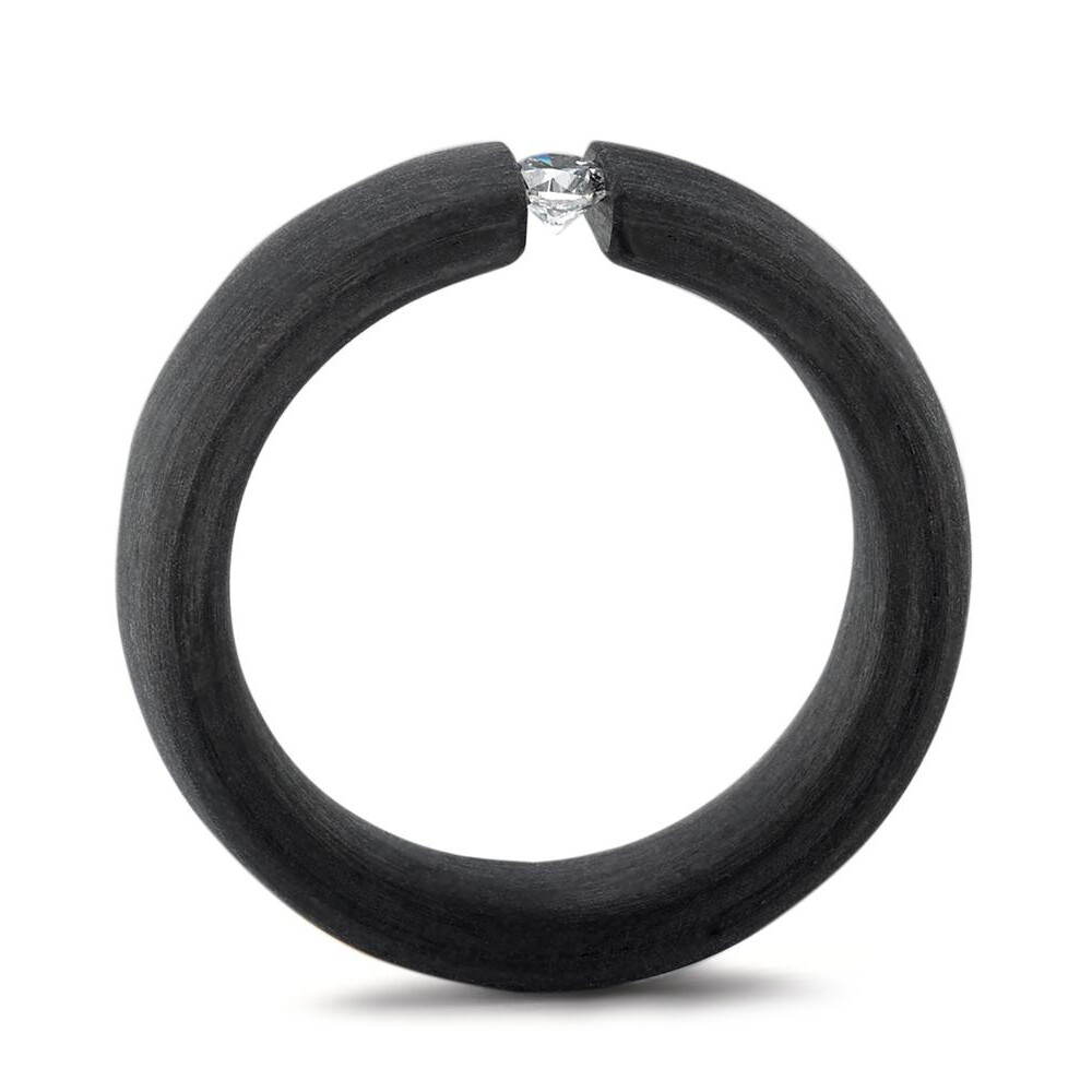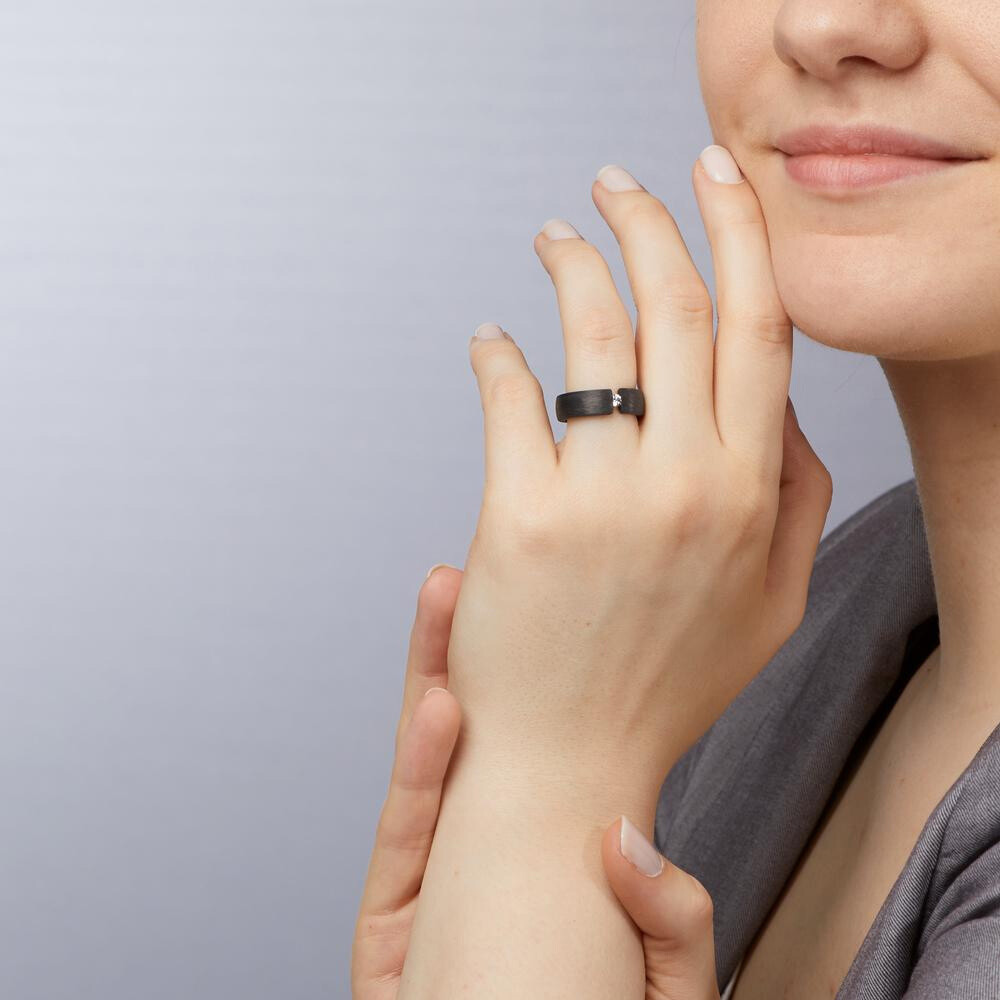 Schwarze Carbon Trauringe und Partnerringe von TitanFactory mit einem funkelnden Diamanten am Damenring, ein Spannring. Beide Ringe sind innen und außen leicht bombiert - für einen optimalen Tragekomfort.