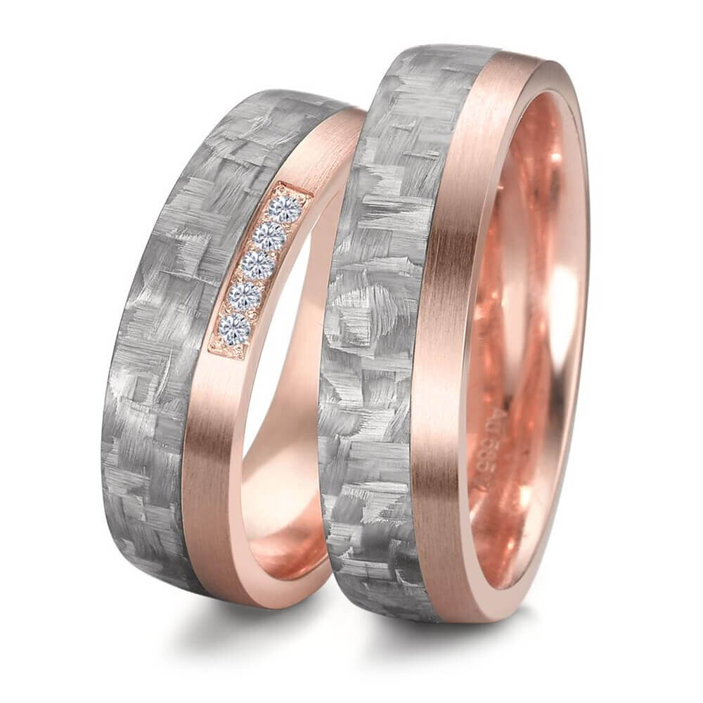 Wunderschöne Trauringe aus Carbon in grau im Zusammenspiel mit 585er Rotgold und mehreren strahlenden Diamanten am Damenring. Beide Ringe sind außen und innen leicht bombiert - für einen optimalen Tragekomfort.