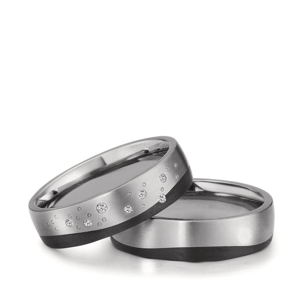 Wunderschöne Trauringe aus Titan im Zusammenspiel mit Carbon und sieben strahlenden Diamanten am Damenring. Beide Ringe sind außen und innen leicht bombiert - für einen optimalen Tragekomfort.
