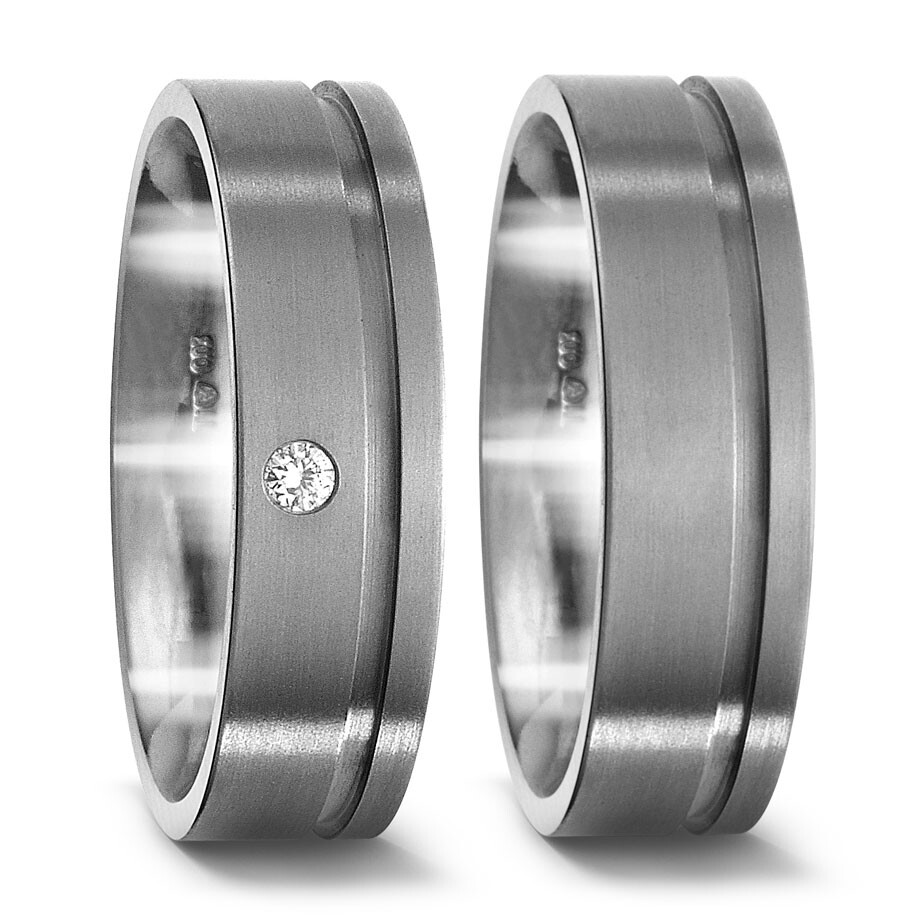 Herrliche Trauringe aus Titan. Beide Ringe sind mattiert und haben eine asymetrische Fuge. Der Damenring hat einen strahlenden 0,03 Carat in w/si Schmuckqualität.