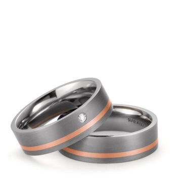 Wunderschön mattierte Trauringe aus Titan mit einem umlaufenden Streifen aus 750er Rotgold. Der Damenring ist mit einem strahlenden Diamanten (0,03 ct. w/si) veredelt. Für angenehmen Tragekomfort sind beide Ringe innen bombiert. Außen ist der in Deutschland gefertigte Ring mit geraden Kanten versehen.