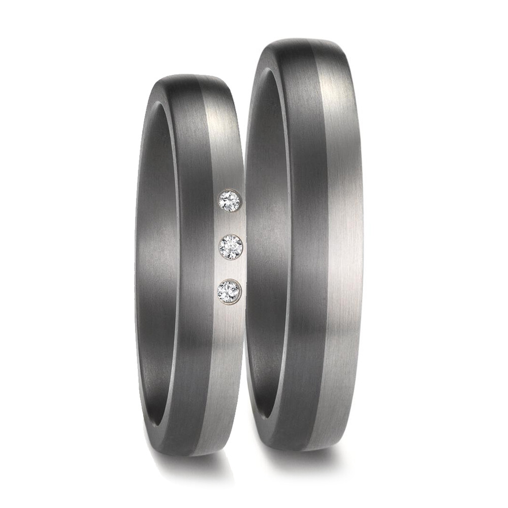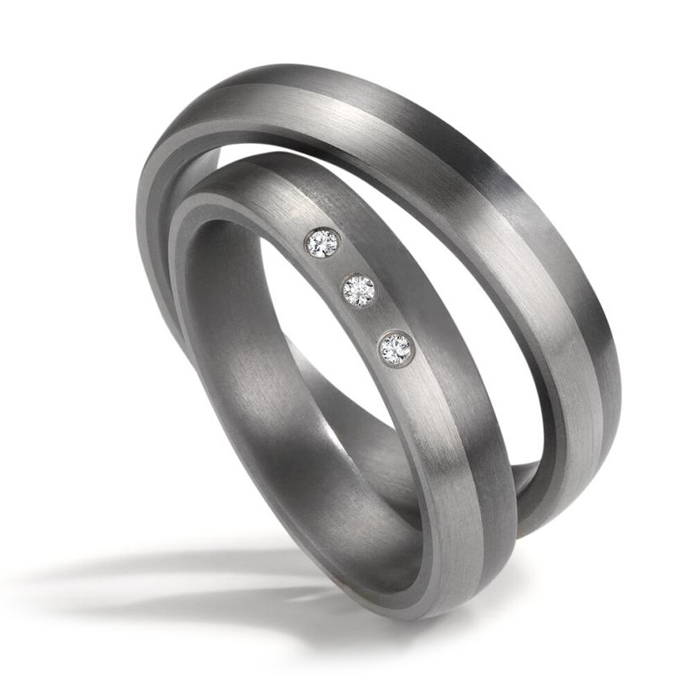 Moderne Trauringe aus Tantal und Platin mit mattierter Oberfläche. Der Damenring ist mit drei funkelnden Diamanten (ges. 0,030 ct. w/si) besetzt. Beide Ringe, welche auch als Partnerringe getragen werden können, sind Made in Germany und aus dem sehr seltenen Material Tantal in Kombination mit 600er Platin gefertigt. Gern gravieren wir diese Ringe mit Ihrem individuellen Wunschtext.