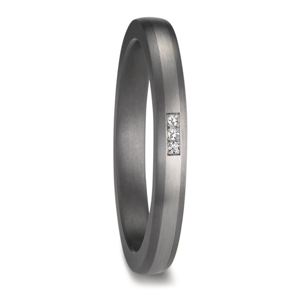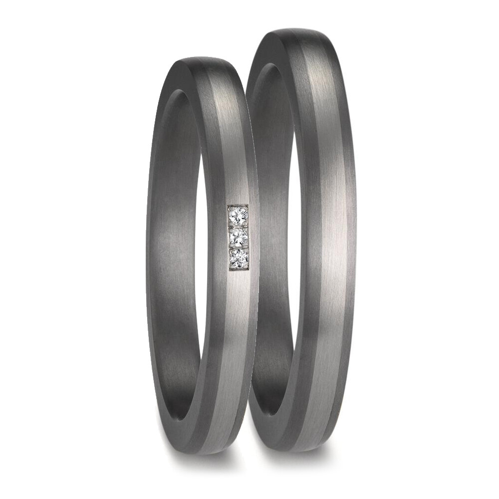 Moderne Trauringe aus Tantal und Platin mit mattierter Oberfläche. Der Damenring ist mit mehreren funkelnden Diamanten (ges. 0,01 ct. w/si) besetzt. Beide Ringe, welche auch als Partnerringe getragen werden können, sind Made in Germany und aus dem sehr seltenen Material Tantal in Kombination mit 600er Platin gefertigt. Gern gravieren wir diese Ringe mit Ihrem individuellen Wunschtext.
