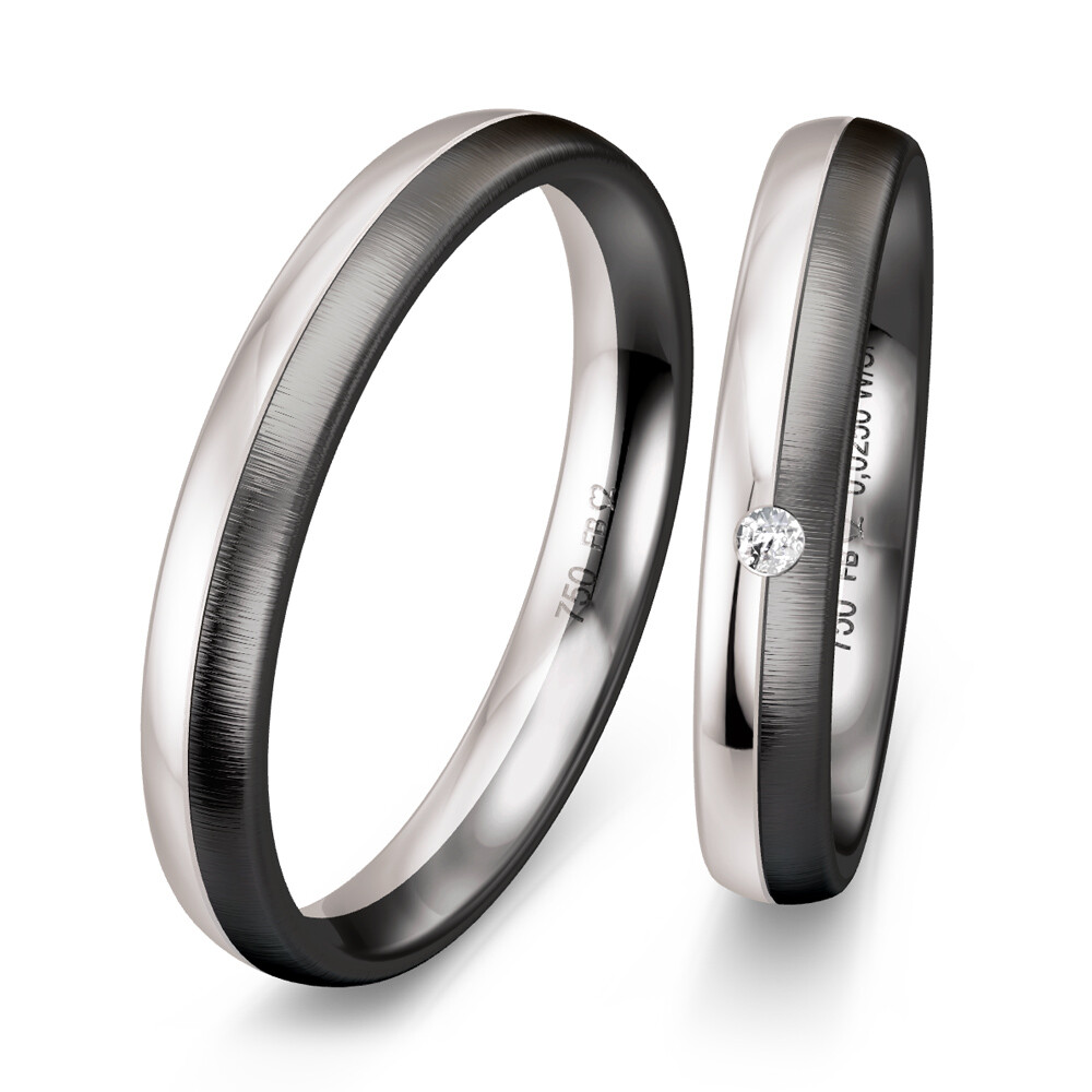 Faszinierende Bicolor Trauringe aus rhodiniertem Weißgold und rutheniertem Graugold aus der Kollektion Black and White von Breuning. Diese schmalen Ringe – nur ca. 3,5 mm breit – mit zu einer Hälfte poliert, die Hälfte aus dem dunkleren Graugold ist matt gehalten. Der Damenring ist daüber hinaus mit einem funkelnden Brillanten veredelt. Beide Ringe sind bombiert, für optimalen Tragekomfort.