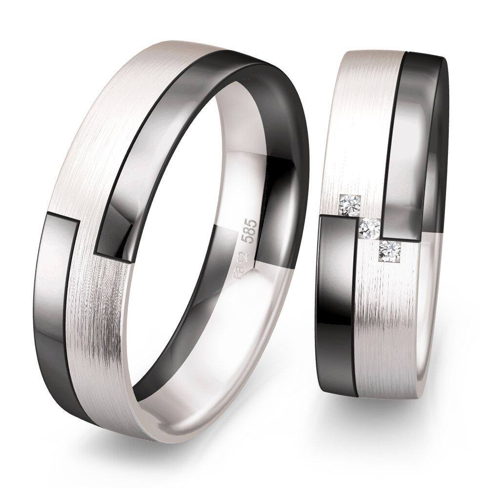 Mehrfarbige Trauringe von Breuning aus 585/750er Graugold und Weißgold mit drei stufig versetzen Diamanten am Damenring mit insgesamt 0,03 ct. w/si (weiß, mit kleinen Einschlüssen). Beide ca. 6 mm breiten RInge aus der Kollektion "Black & White 2" sind bombiert, für angenehmen Tragekomfort.