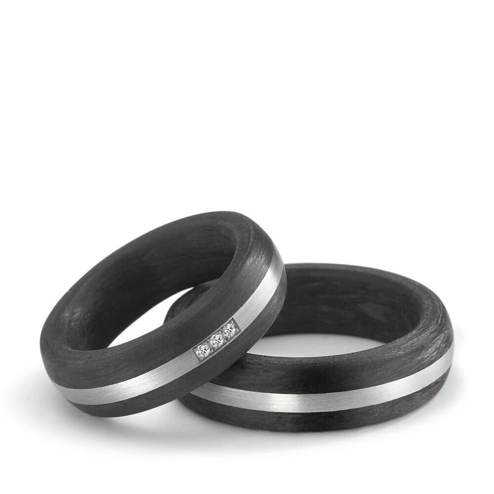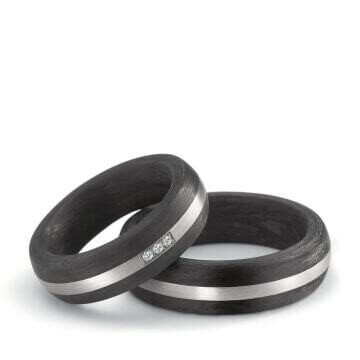 Großartige Trauringe / Partnerringe aus starkem schwarzen Carbon und seltenem Palladium - ganz spezielle Ringe für alle, die es etwas ausgefallener mögen. Der Damenring besitzt 3 strahlende Brillanten in einer gesamt Carat Zahl von 0,03 mit der Schmuckqualität w/si. Ganz besonders & stark - genau wie Eure Liebe!