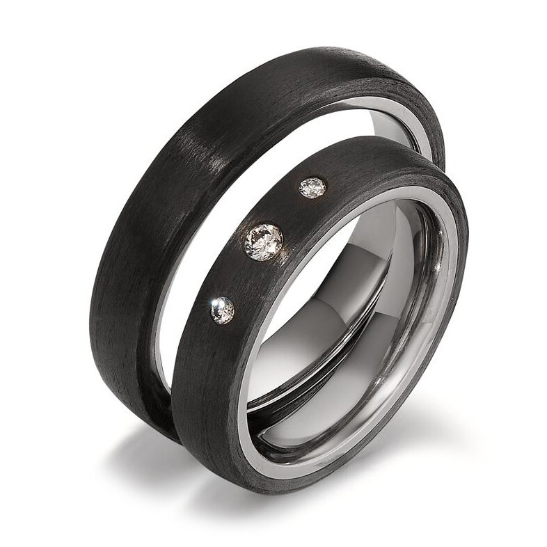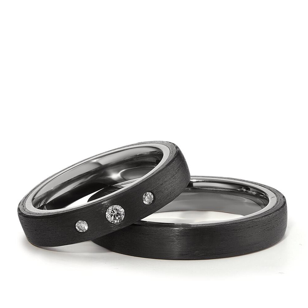 Faszinierende Trauringe oder Partnerringe aus Titan und Carbon. Den Damenring zieren 3 strahlende Brillanten, wobei der mittlere etwas größer als die äußeren ist. Beide Ringe sind innen und außen leicht bombiert – für ein optimales Tragegefühl. Eheringe mit Carbon Made in Germany.