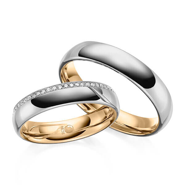 Paar Trauringe / Eheringe von Rubin Außen und innen gerundet in Innen Roségold 585/- , außen Graugold 585/-. Steinbesatz mit zus. ca. 0,135 ct. tw, si - feines weiß mit kleinen Einschlüssen.