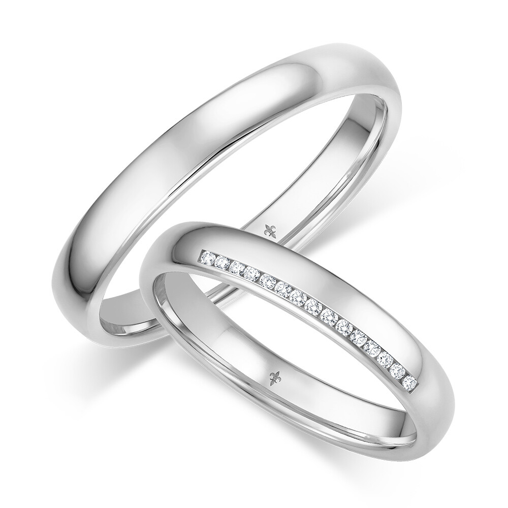 Faszinierende Trauringe Ella aus Weißgold von der Manufaktur Giloy mit polierter Oberfläche. Der Damenring ist mit mehreren strahlenden Diamanten im Brillantschliff veredelt. Beide Ringe sind bombiert, für angenehmen Tragekomfort.