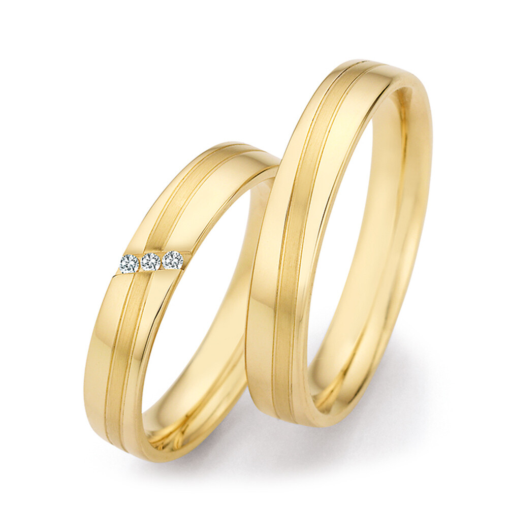 Wunderschöne, elegante Trauringe aus Gelbgold der Marke Collection Ruesch aus der Kollektion Honeymoon Solid XVI mit teils mattierter Oberfläche. Diese edlen Eheringe mit 3 funkelnden Brillanten am Damenring sind für einen angenehmen Tragekomfort bombiert (abgerundet).