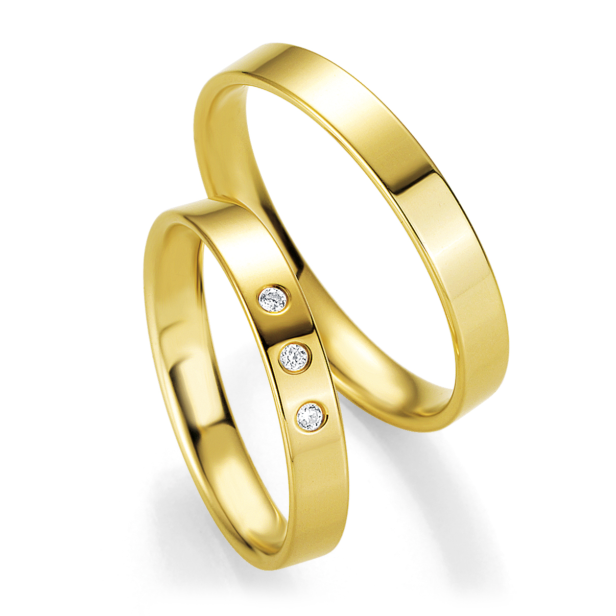 Schlichte 3,5 mm breite Trauringe aus Gelbgold mit polierter Oberfläche. Der Damenring ist mit drei funkelnden Brillanten veredelt. Beide Ringe aus der Kollektion Profil Light von Breuning sind bombiert, für optimalen Tragekomfort-