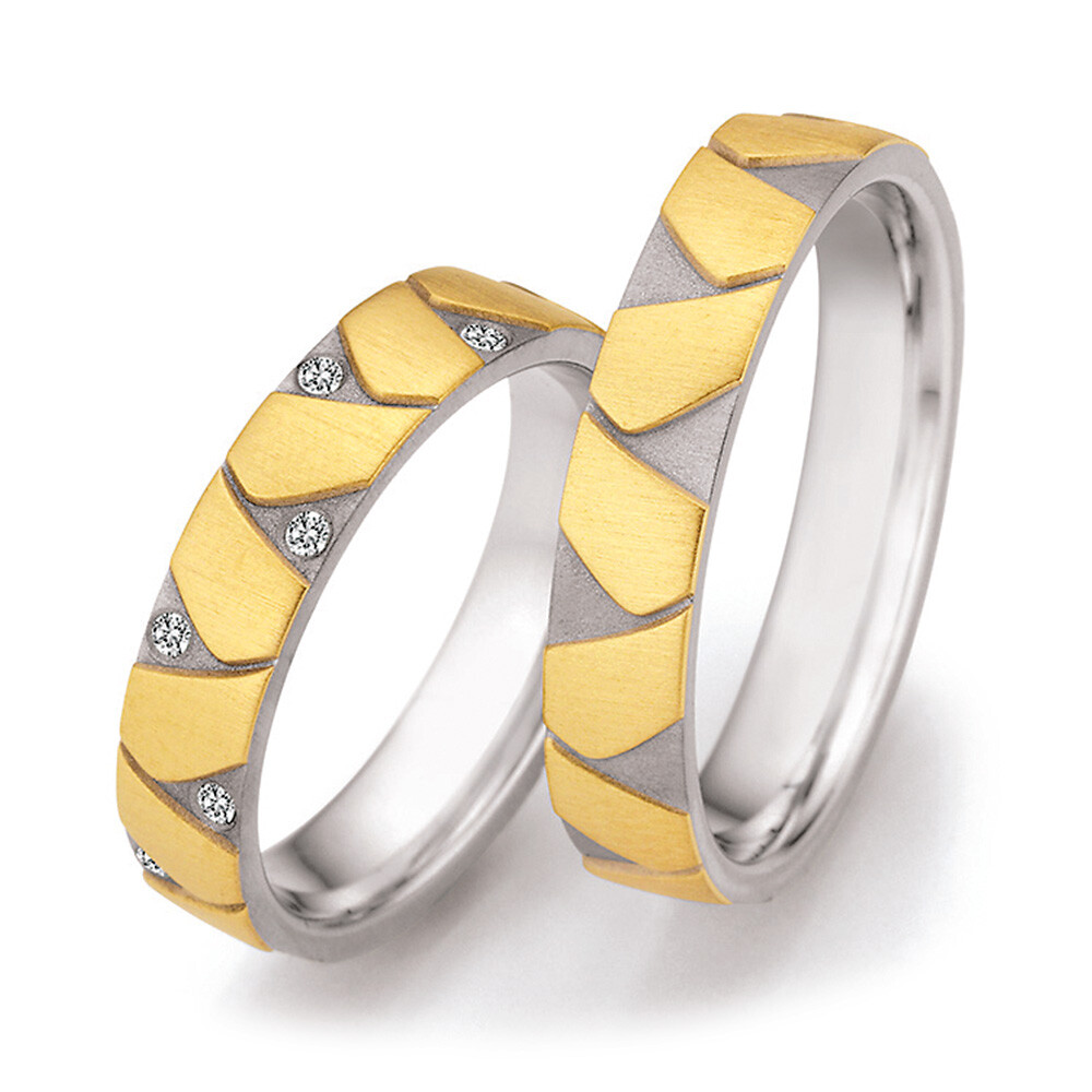 Wunderschöne, elegante Trauringe aus mattiertem Gelbgold und Weißgold mit faszinierendem Muster der Marke Collection Ruesch aus der Kollektion Honeymoon Solid XVII. Diese edlen Eheringe mit mehreren funkelnden Brillanten am Damenring sind für einen angenehmen Tragekomfort bombiert (abgerundet).
