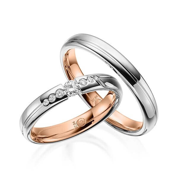 Paar Trauringe / Eheringe von Rubin Außen und innen gerundet in außen Graugold dunkel 375/- , innen Rotgold 375/-. Steinbesatz mit zus. 0,14 ct. tw, si - feines weiß mit kleinen Einschlüssen.