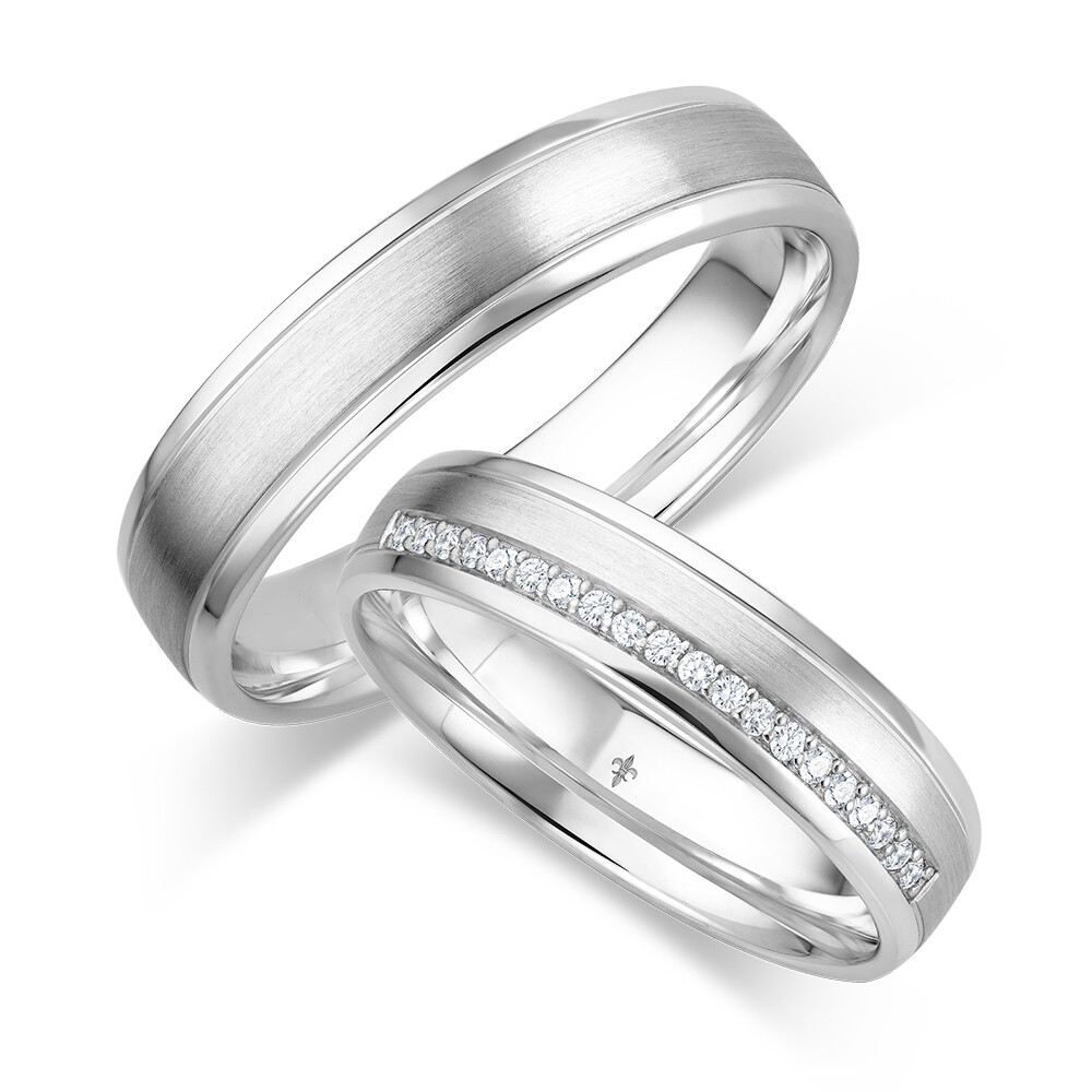 Faszinierende Trauringe Jade aus Weißgold von der Manufaktur Giloy mit teilmattierter Oberfläche. Der Damenring ist mit mehreren strahlenden Diamanten im Brillantschliff veredelt. Beide Ringe sind bombiert, für angenehmen Tragekomfort.
