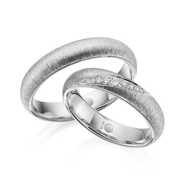 Paar Trauringe / Eheringe von Rubin Außen stark, innen leicht gerundet in Palladium 585/-. Steinbesatz mit zus. 0,114 ct. tw, si - feines weiß mit kleinen Einschlüssen.
