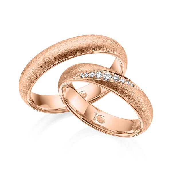 Paar Trauringe / Eheringe von Rubin Außen stark, innen leicht gerundet in Rotgold 333/-. Steinbesatz mit zus. 0,114 ct. tw, si - feines weiß mit kleinen Einschlüssen.