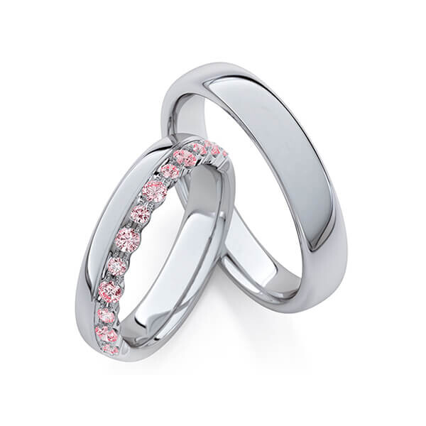 Paar Trauringe / Eheringe von Rubin Außen stark, innen leicht gerundet in Graugold 375/-. Steinbesatz mit zus. 0,38 ct. Pink - Pink (Farb behandelte Diamanten).
