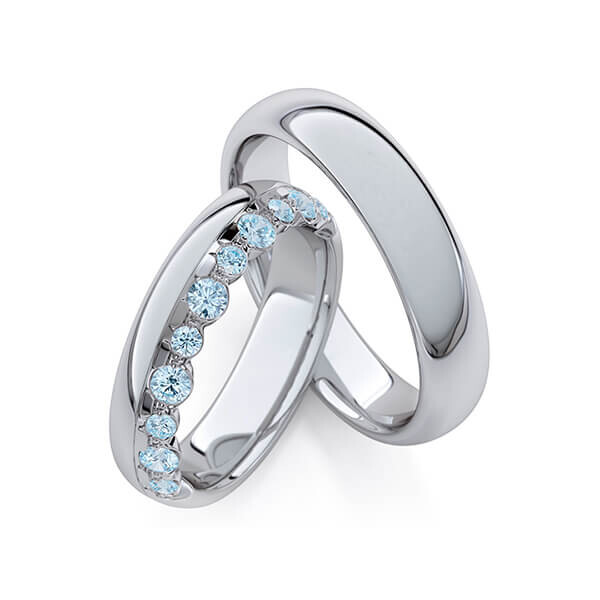 Paar Trauringe / Eheringe von Rubin Außen stark, innen leicht bombiert in Graugold 375/-. Steinbesatz mit zus. 0,475 ct. Skyblue - Skyblue (Farb behandelte Diamanten).