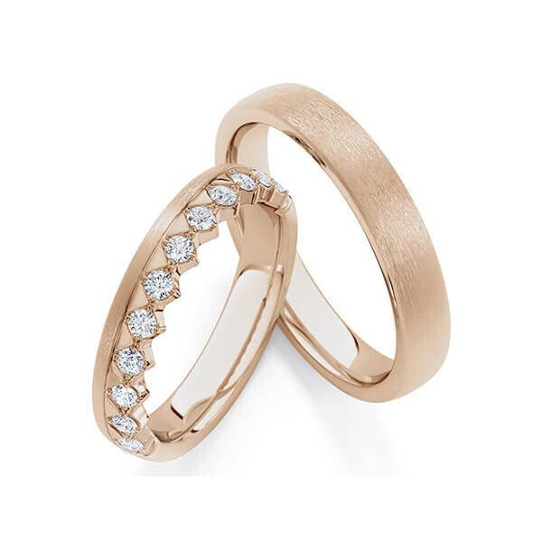 Paar Trauringe / Eheringe von Rubin Außen und innen leicht gerundet, gerade Kanten in Peach-Gold 585/-. Steinbesatz mit zus. ca. 0,36 ct. tw, si - feines weiß mit kleinen Einschlüssen.