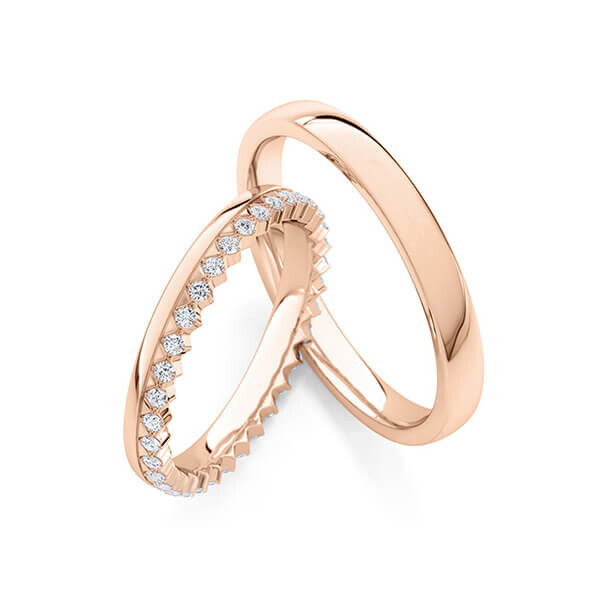 Paar Trauringe / Eheringe von Rubin Außen und innen leicht gerundet, gerade Kanten in Rotgold 333/-. Steinbesatz mit zus. ca. 0,31 ct. tw, si - feines weiß mit kleinen Einschlüssen.