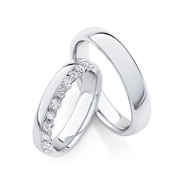 Paar Trauringe / Eheringe von Rubin Außen stark, innen leicht gerundet in Weißgold 333/-. Steinbesatz mit zus. 0,38 ct. tw, si - feines weiß mit kleinen Einschlüssen.