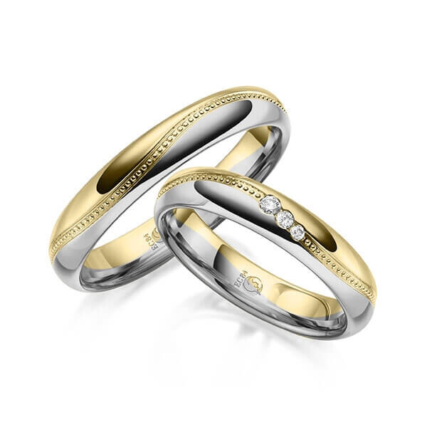 Paar Trauringe / Eheringe von Rubin Außen stark, innen leicht gerundet in Gelbgold 585/- Palladium 585/-. Steinbesatz mit zus. 0,06 ct. tw, si - feines weiß mit kleinen Einschlüssen.