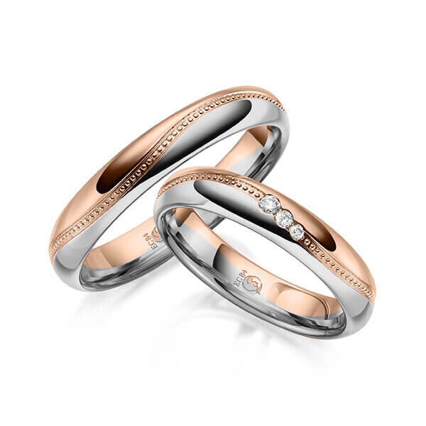 Paar Trauringe / Eheringe von Rubin Außen stark, innen leicht gerundet in Rotgold 585/- Graugold 585/-. Steinbesatz mit zus. 0,06 ct. tw, si - feines weiß mit kleinen Einschlüssen.