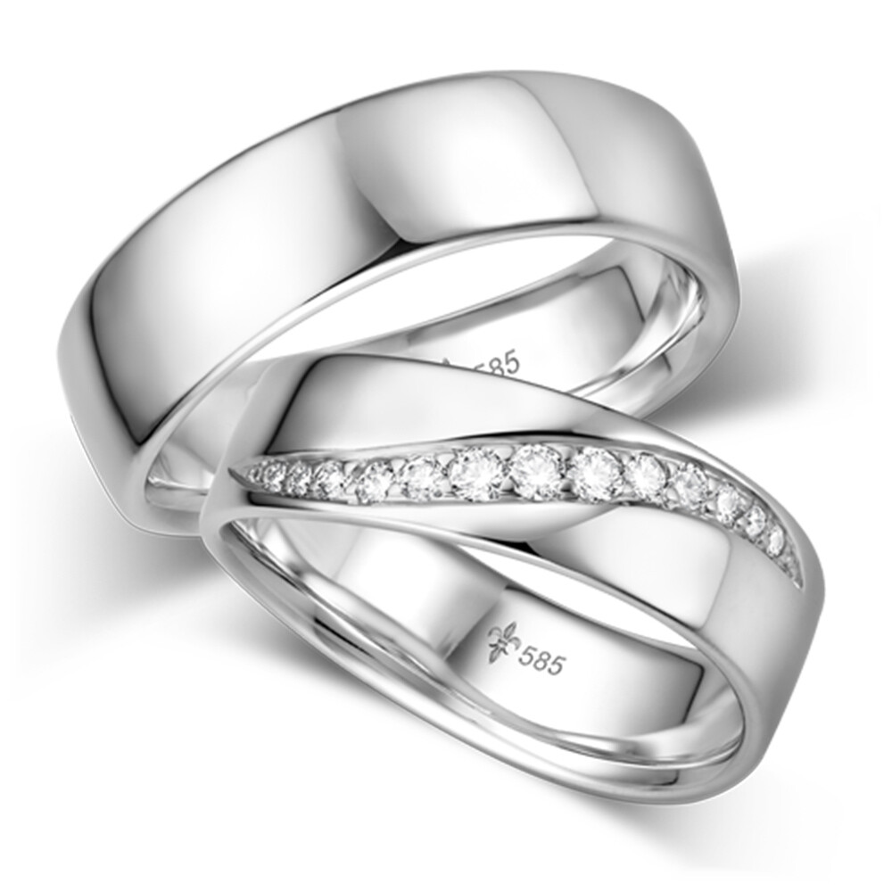 Außergewöhnliche breite Eheringe und Trauringe Milou in Weißgold mit polierter Oberfläche. Der Damenring ist mit mehreren strahlenden Diamanten im Brillantschliff veredelt. Beide schönen Ringe sind bombiert, für angenehmen Tragekomfort.