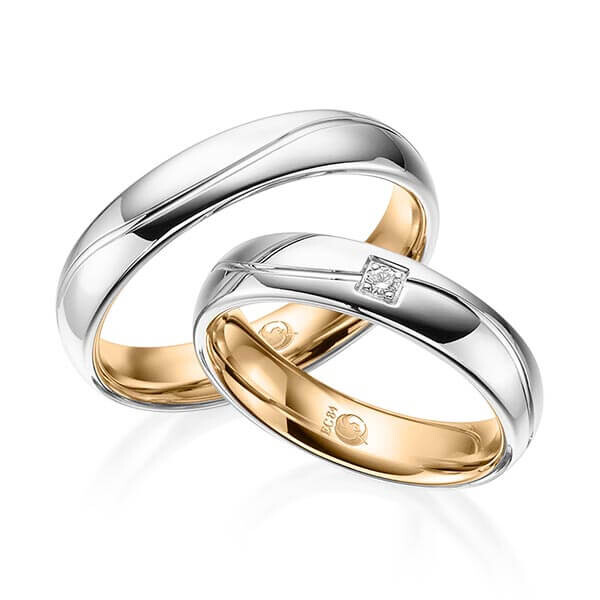Paar Trauringe / Eheringe von Rubin Außen und innen gerundet in außen Palladium 950/- , innen Roségold 585/-. Steinbesatz mit zus. 0,03 ct. tw, si - feines weiß mit kleinen Einschlüssen.