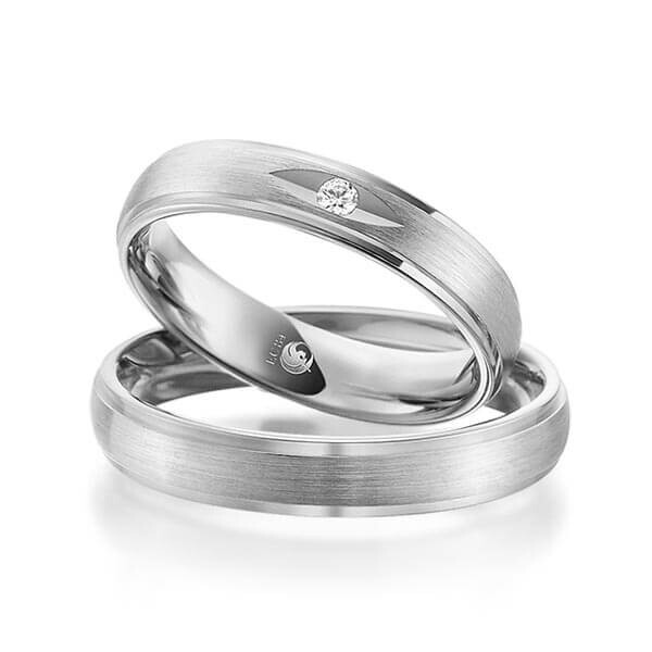 Paar Trauringe / Eheringe von Rubin Außen und innen gerundet in Palladium 585/-. Steinbesatz mit zus. 0,03 ct. tw, si - feines weiß mit kleinen Einschlüssen.