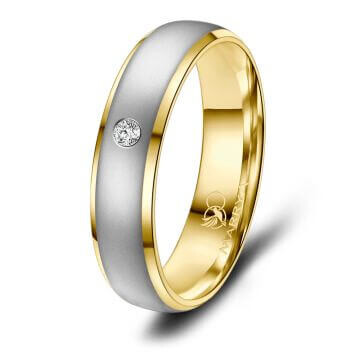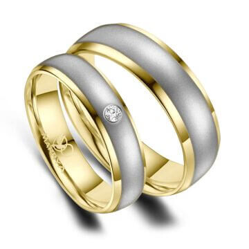 Hochwertige Trauringe / Partnerringe Edelstahl mit Gelbgoldplattierung. Der Damenring besitzt einen funkelnden, eingeriebenen Zirkonia. Diese wunderschönen Bicolor Edelstahlringe sind hochwertig verarbeitet und sitzen durch ihre Bombierung (an der Ringinnenseite abgerundet) sehr bequem am Finger.