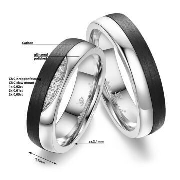Ob Partnerringe oder Trauringe - diese Ringe aus glänzend poliertem Gelbgold und schwarzem Carbon mit strahlendem Zirkonia-Besatz am Damenring werden Sie viele glückliche Jahre begleiten. Zusätzlich sind die Ringe von innen abgerundet (bombiert). Dies sorgt für ein besonders angenehmes Tragegefühl am Finger. Ein besonderer Materialmix für besondere Paare wie Ihr es seid!